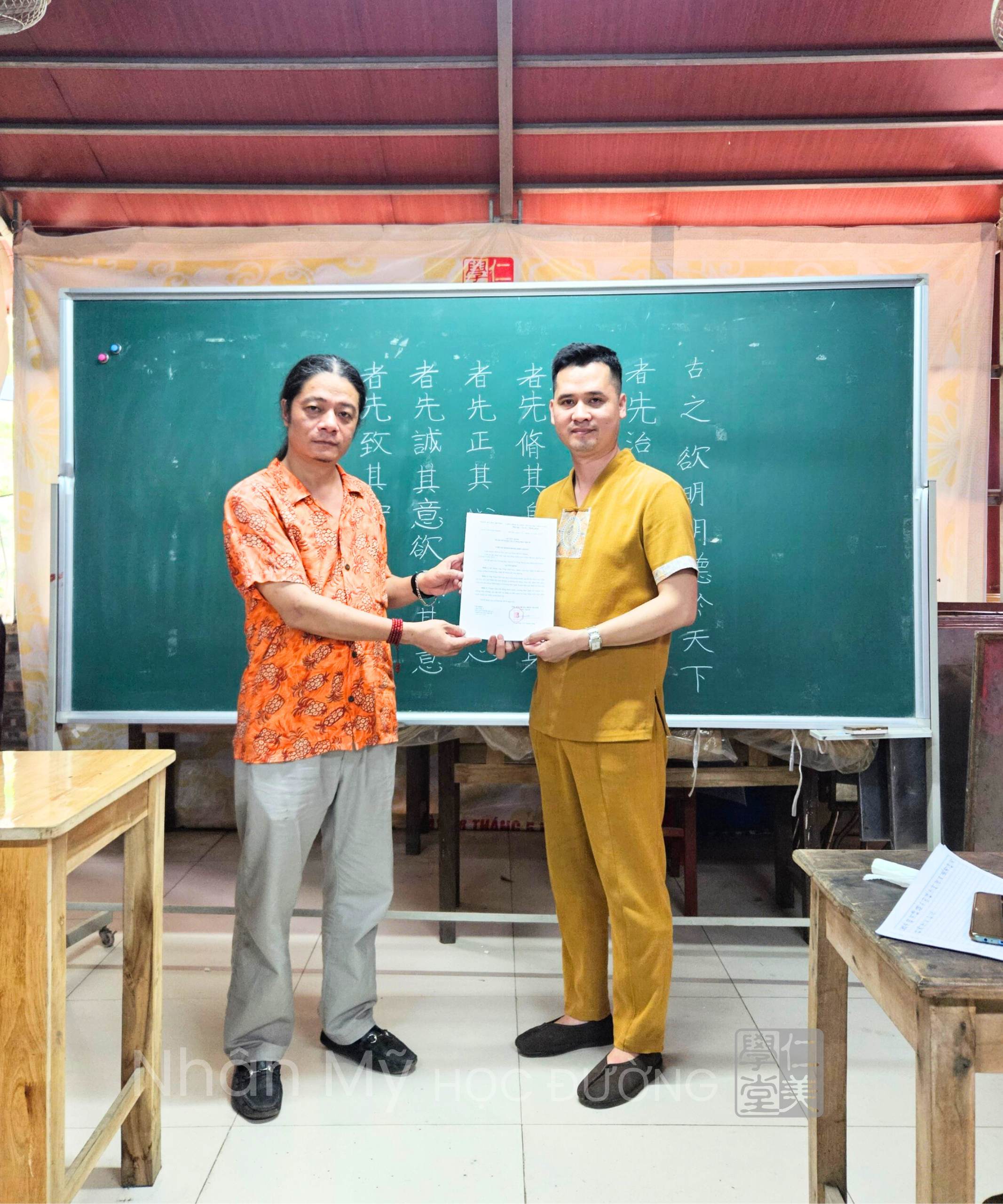 Chủ tịch Hội đồng Điều hành NMHĐ, Giảng sư Xuân Như Vũ Thanh Tùng trao Quyết định bổ nhiệm thành viên Ban Đào tạo cho Giảng viên bộ môn Thư pháp Bùi Hải Nam.