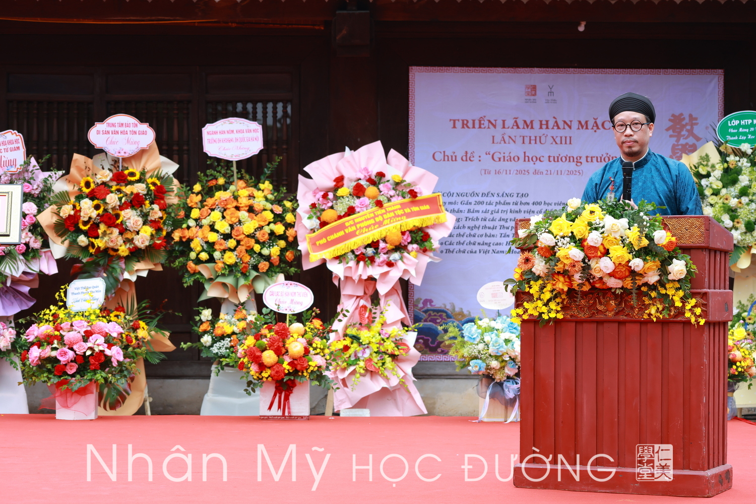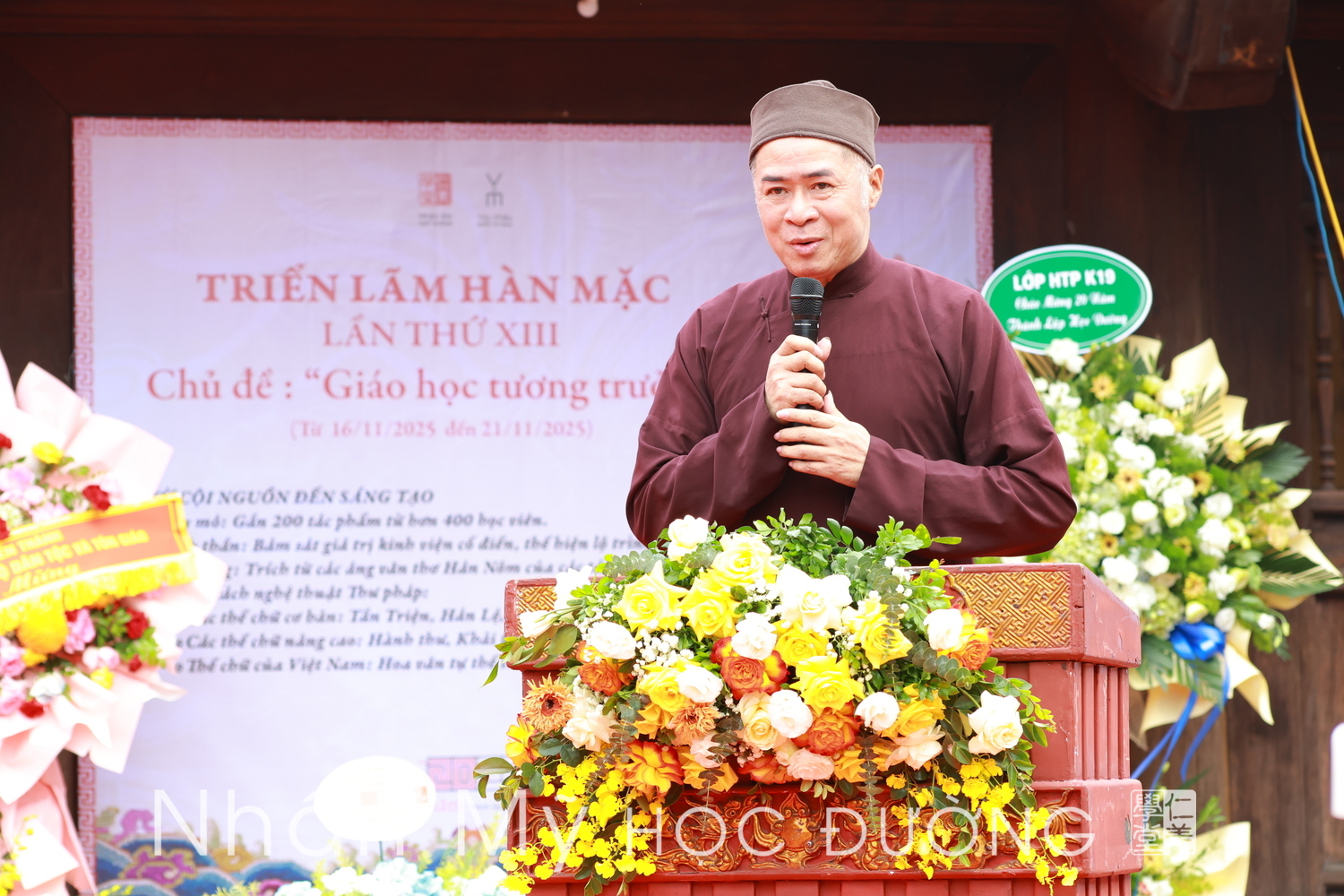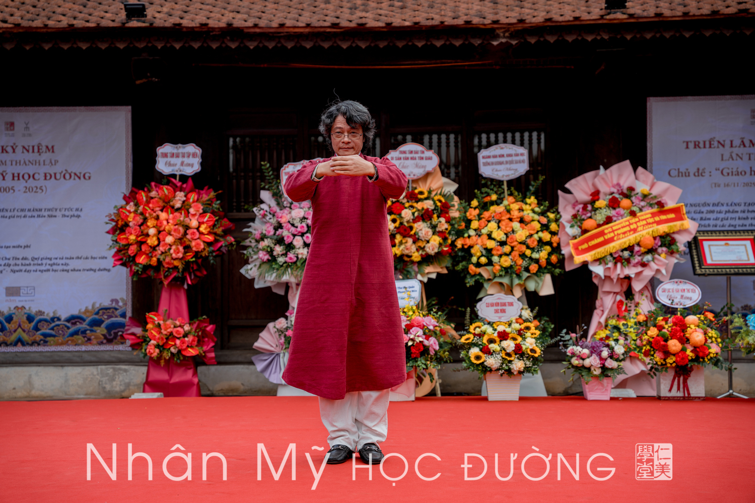 "Triển lãm năm nay tụ hội 200 tác phẩm của chư vị môn sinh Nhân Mỹ bốn phương, có cả của thầy và trò. Mỗi bức thư pháp đều là kết quả của tháng ngày rèn tập dùi mài, thể hiện chí hướng lập thân, tâm tình dụng đạo, ý vị nghệ học. Hơn nữa, nội dung của văn từ, câu chữ thảy đều là của các bậc tiền nhân lưu danh sử sách nước ta. Ở đó, người xem có thể từ nét bút biết ý chí, từ bố cục mà nghiệm ra tâm tình.
