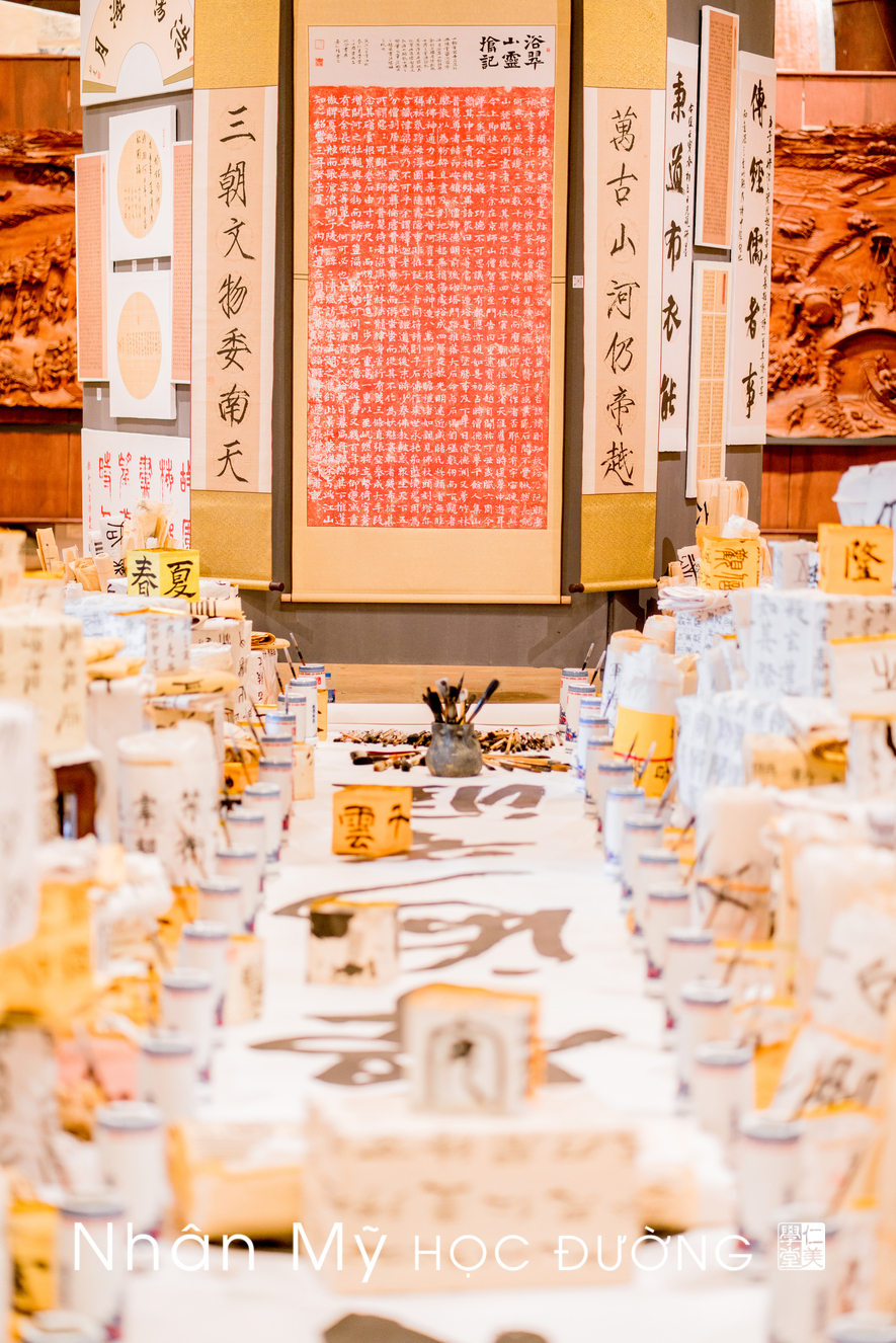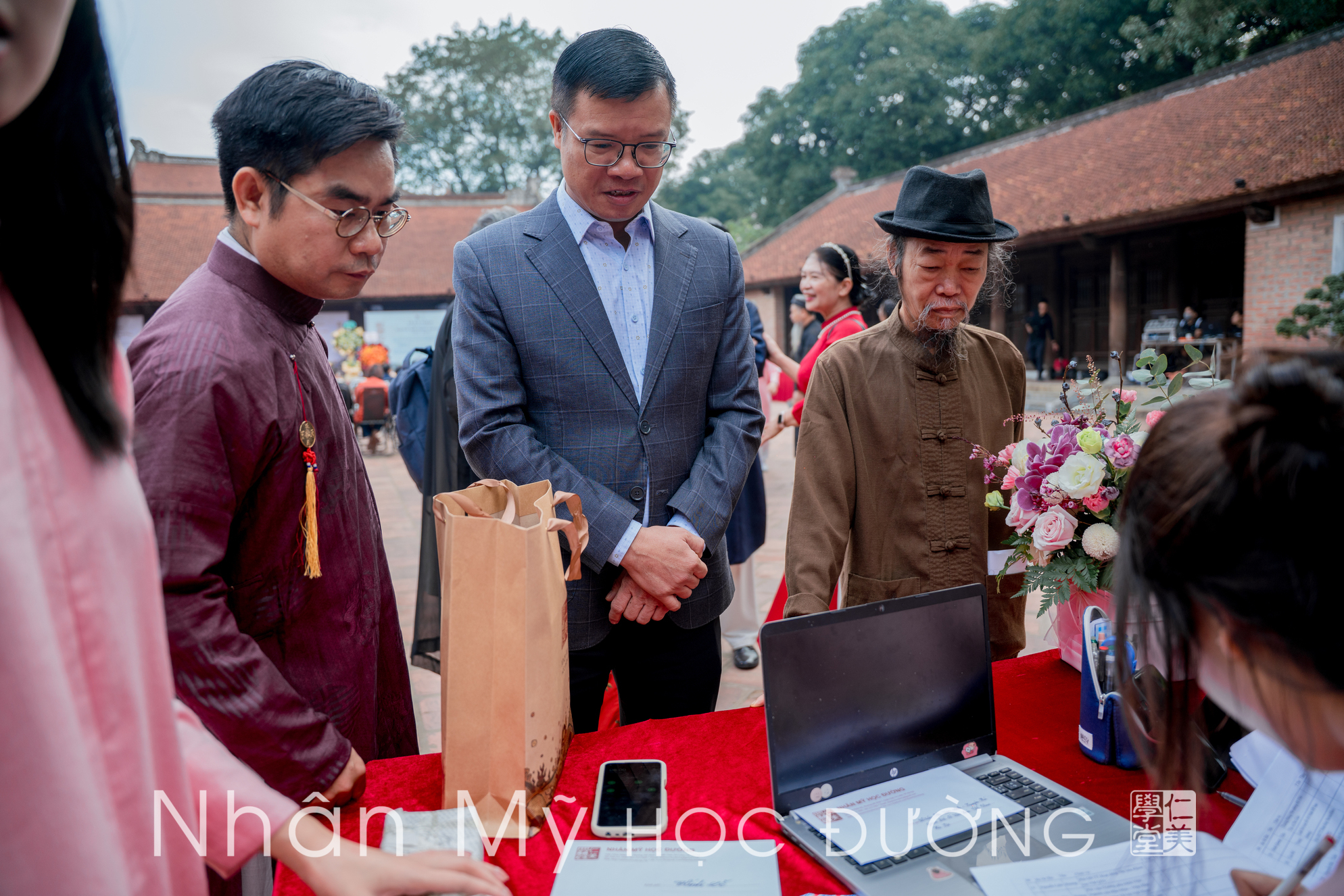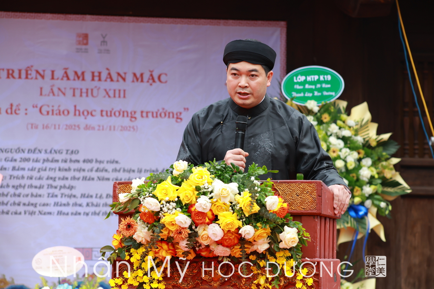 "Triển lãm năm nay tụ hội 200 tác phẩm của chư vị môn sinh Nhân Mỹ bốn phương, có cả của thầy và trò. Mỗi bức thư pháp đều là kết quả của tháng ngày rèn tập dùi mài, thể hiện chí hướng lập thân, tâm tình dụng đạo, ý vị nghệ học. Hơn nữa, nội dung của văn từ, câu chữ thảy đều là của các bậc tiền nhân lưu danh sử sách nước ta. Ở đó, người xem có thể từ nét bút biết ý chí, từ bố cục mà nghiệm ra tâm tình.