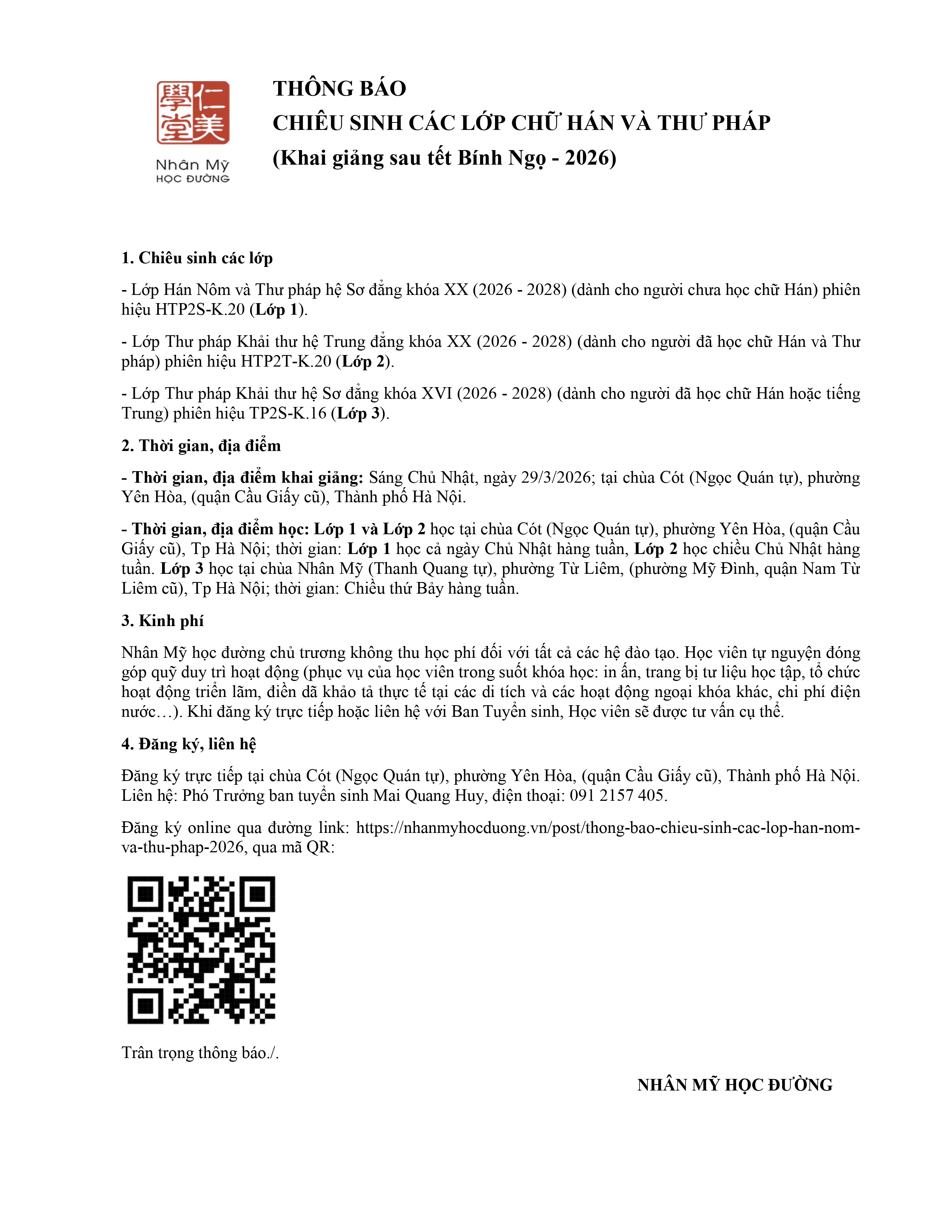 Chương trình đào tạo được tổ chức bài bản, lâu dài, dành cho cả người mới bắt đầu và người đã có nền tảng Hán Nôm, Thư pháp. Với tinh thần bảo tồn và lan tỏa giá trị văn hóa truyền thống, Nhân Mỹ học đường mong muốn tạo dựng một môi trường học tập nghiêm túc, nhân văn và bền vững.